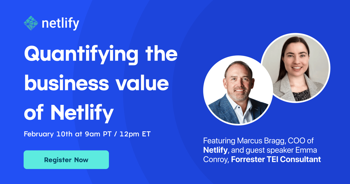 Join us on Thursday, February 10th, at 9am PT / 12pm ET where Marcus Bragg, COO of Netlify, and guest speaker Emma Conroy, Forrester TEI Consultant, share the results of the study and provide a framework to evaluate the ROI of Netlify for your organization.